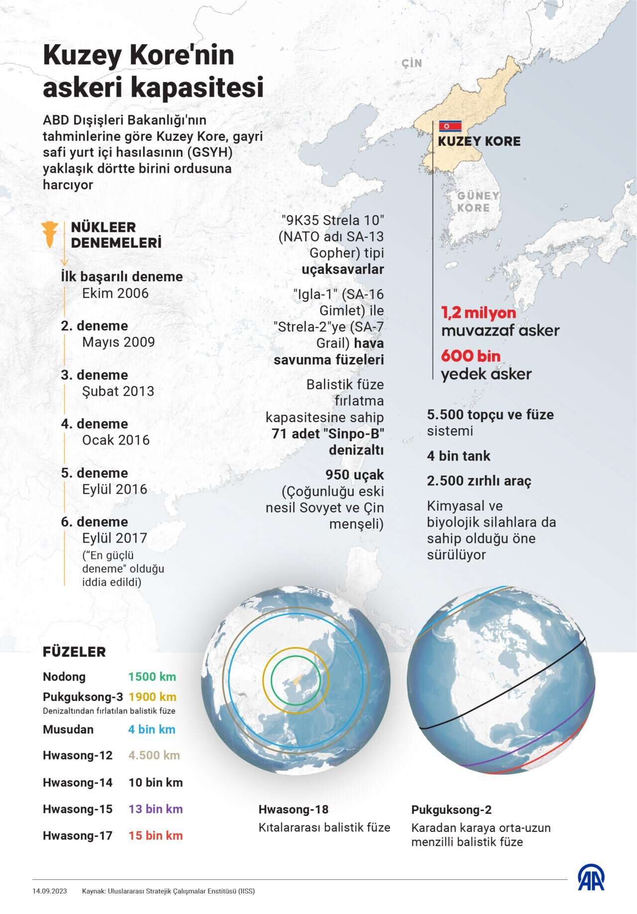 Dolayısıyla Kuzey Kore lideri Kim'in Rusya ziyaretinde "gıda ve teknoloji ithalatı karşılığında silah" anlaşması imzalanacağı yorumları yapılıyor. AA muhabiri, kapalı bir rejim olan ve hakkındaki bilgiler, açık kaynaklı istihbarat verilerinden ve uluslararası basındaki az sayıda haberden oluşan Kuzey Kore'nin askeri kapasitesi, nükleer ve füze denemelerine ilişkin güncel verileri derledi.